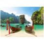 Arena blanca, agua turquesa y los icónicos barcos long-tail de Tailandia frente a la famosa roca de la Isla de James Bond. Una escena luminosa y muy clara que apetece montar por zonas: cielo, mar, barcos y vegetación. Ideal si te atraen los paisajes exóticos y quieres sentir verano mientras encajas piezas.